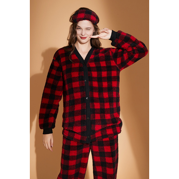 Women Wearing In Autumn Winter Printed Coral Fleece Pajamas Set With Zipper&Embroidery