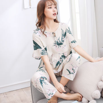 Ladies Spring Summer Cotton Printed Short Sleeve Sleepwear Pajamas Set for Women